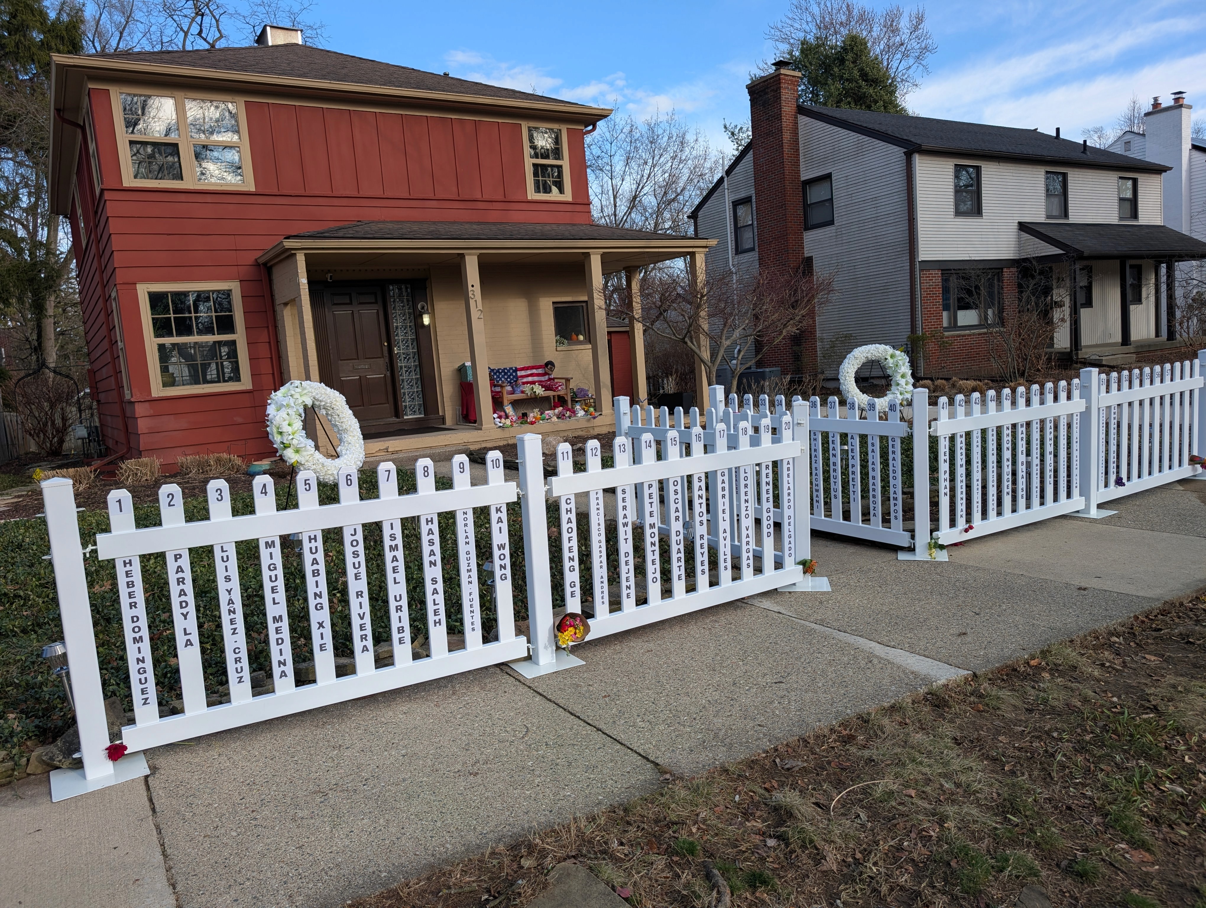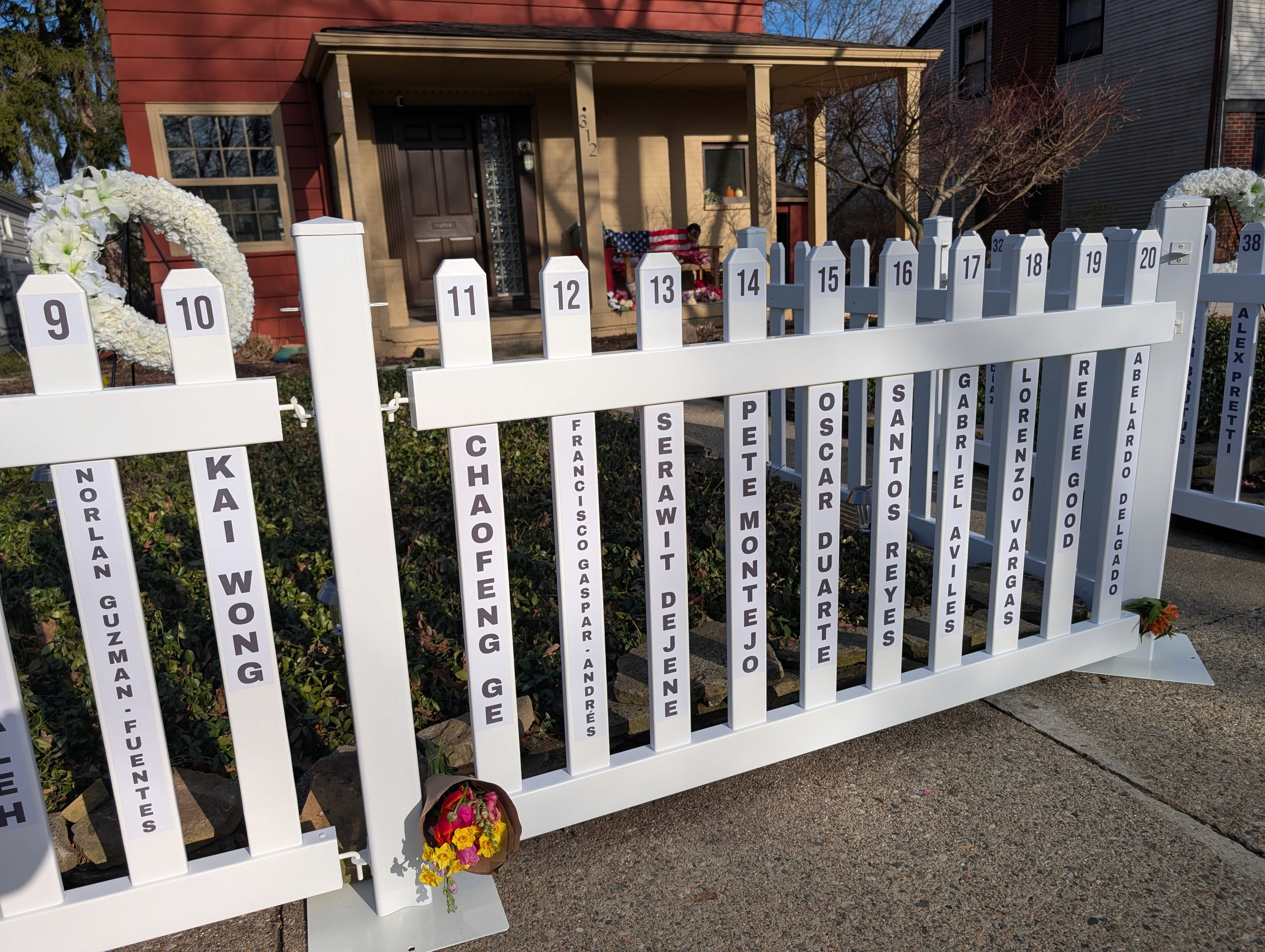 On each slat of the fence are the known names of those who died under custody of and/or killed by agents of the Immigration and Customs Enforcement from January 2025 to recent days. As a foreboding certainty, many slats have been left vacant for the names that are still to come. The clarity of the names on the picket fence slats contrast deeply with the alien identities of fully armed, unidentified, masked Immigration and Customs Enforcement agents responsible for their death.
